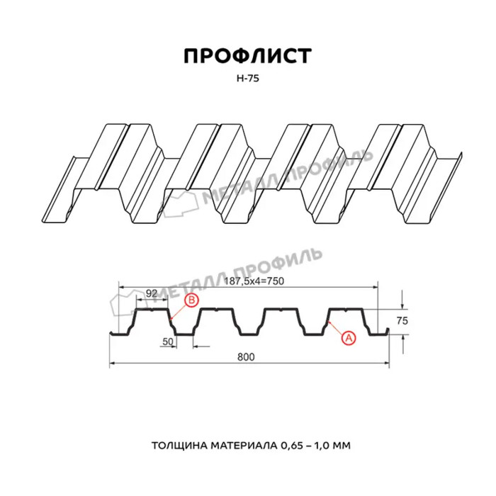 Предлагаем купить профилированный лист Н-75 в Голицыно. Он является оцинкованным стальным материалом, имеющим покрытие. Толщина стальной основы с защитным покрытием составляет 0.8 мм. После проката на специализированном оборудовании лист приобретает рисунок из повторяющихся волн, что значительно увеличивает его жесткость по сравнению с плоским материалом.